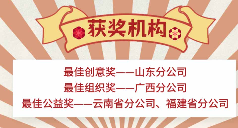 公司为表彰各分公司对此次活动的高度重视和积极组织,同步组织了全国PK赛活动,设置最佳创意奖、最佳公益奖、最佳组织奖三个奖项。通过对32家分公司精彩文字、照片和视频等资料的认真评选,公司最终将三大奖项授予: